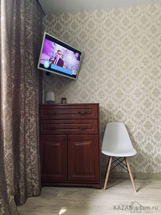 - Спальня: раскладной диван, жк телевизор, комод под TV, стул, предметы декора.
