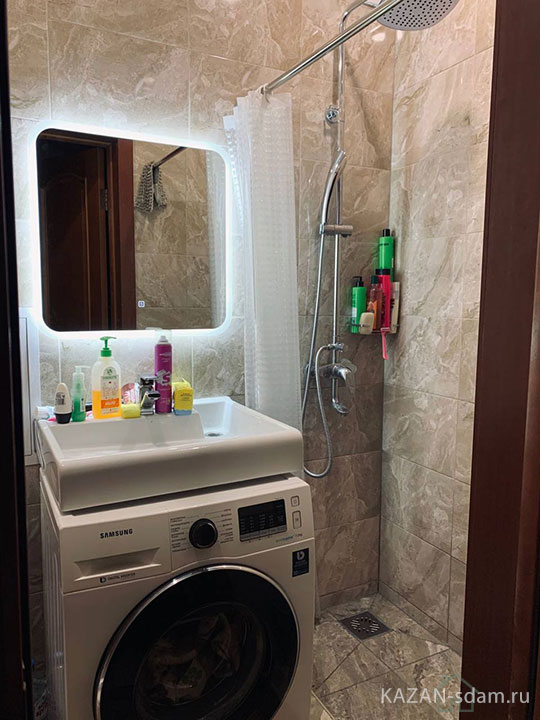 - Санузел: душевая кабина, унитаз, зеркало с подсветкой, тумба с раковиной, стиральная машина автомат.